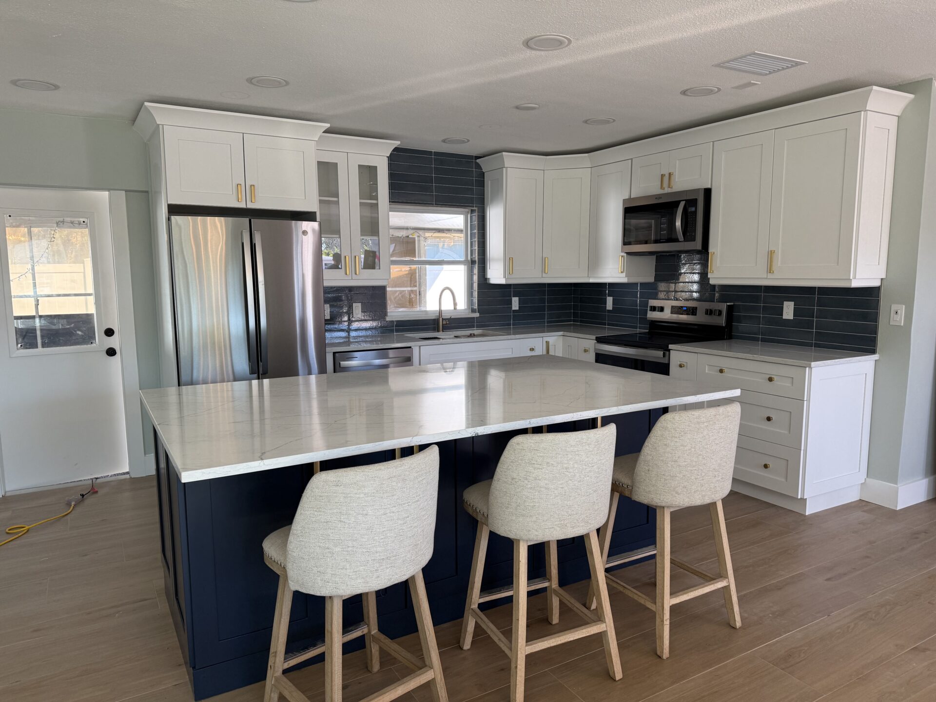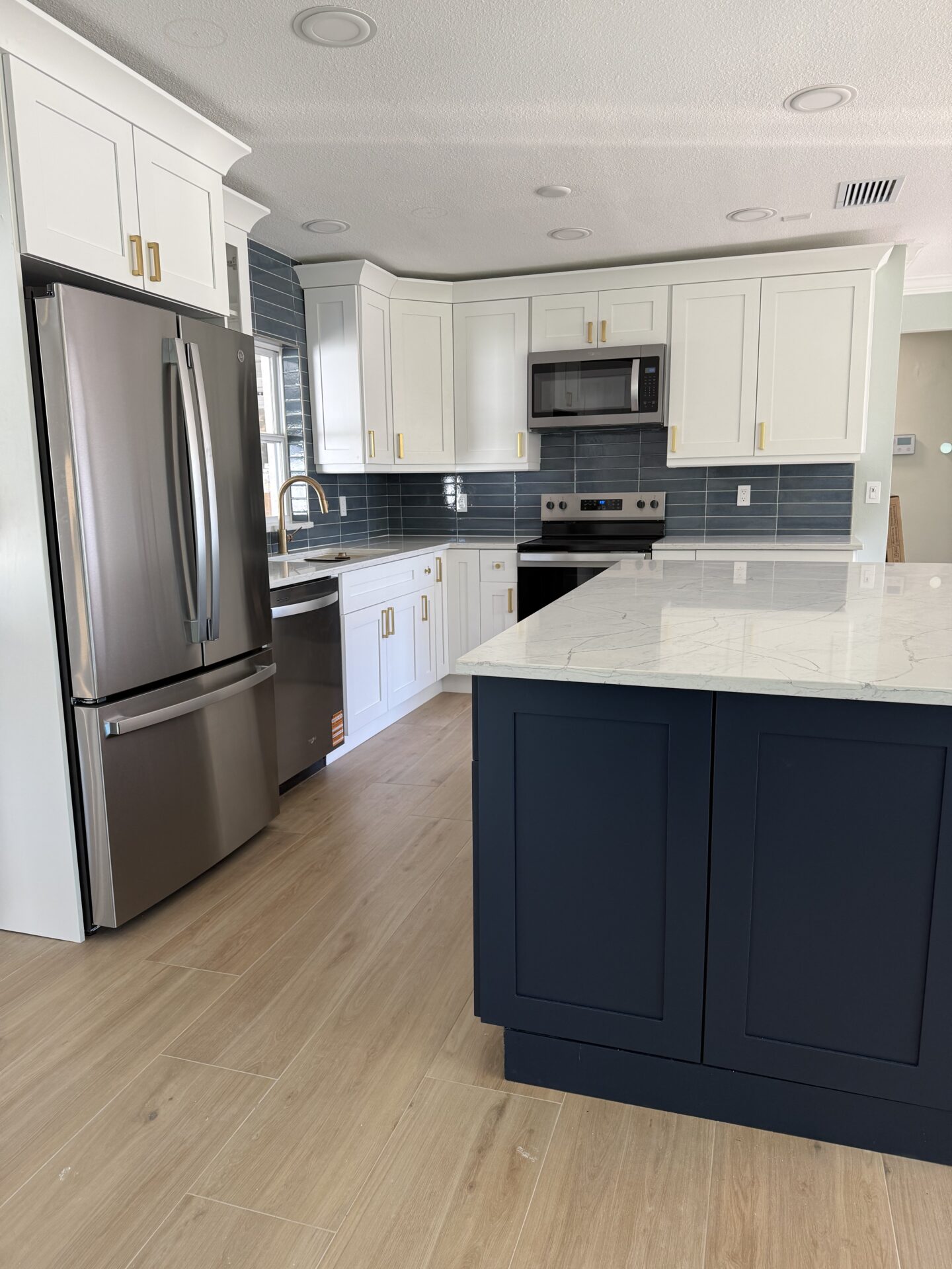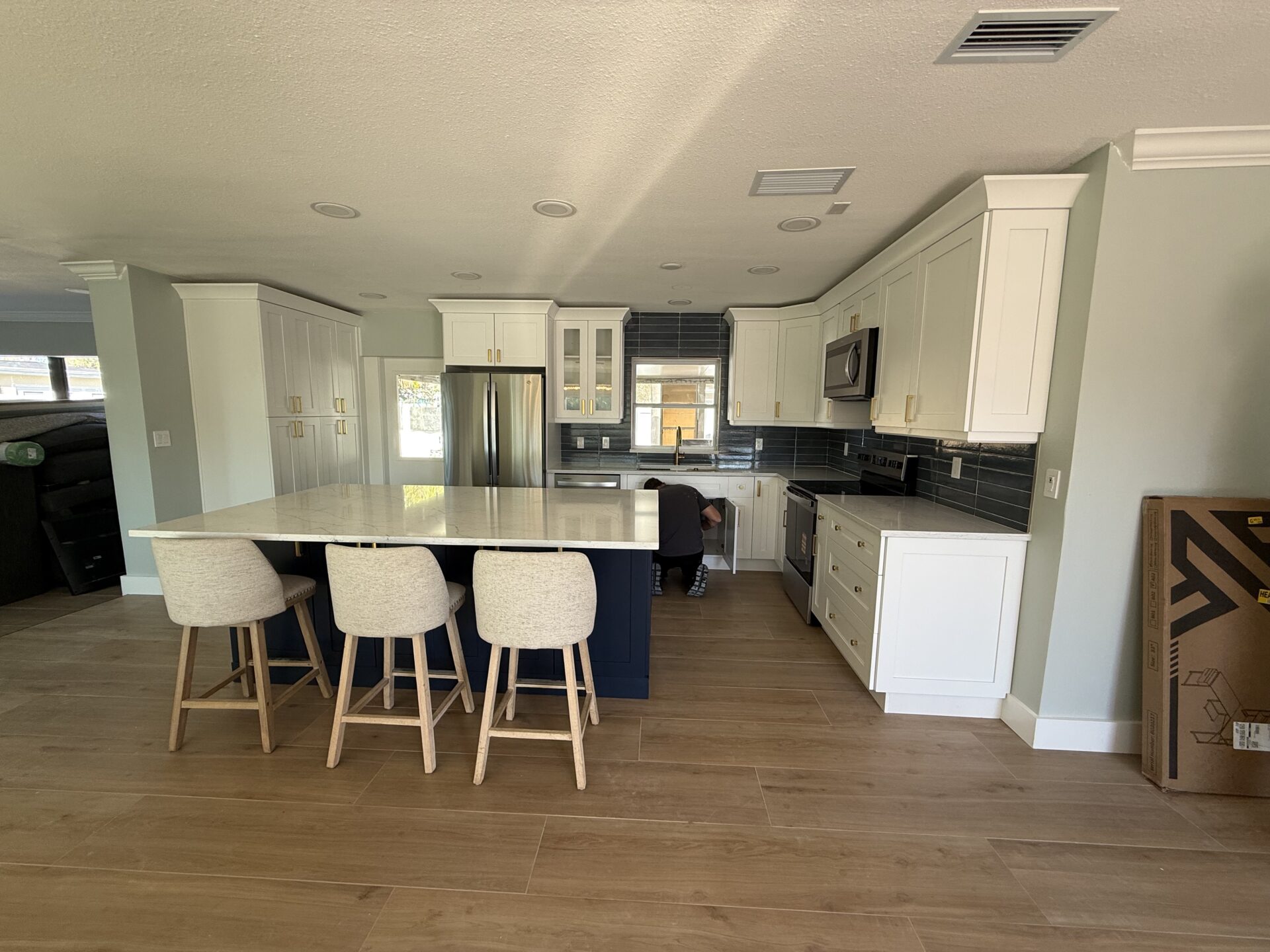 After being Devastated by the Hurricanes of 2024 we had the privilege of renovation a home in St. Pete Beach. We were able to make some great changes creating a bright and "Beachy" Open Floor Plan. The Kitchen is now full of light with White Shaker Cabinets and Navy Blue Island. Both Secondary Bathrooms were made slightly larger and more comfortable with updated tile and cabinetry. Large plank tile flooring was laid throughout.